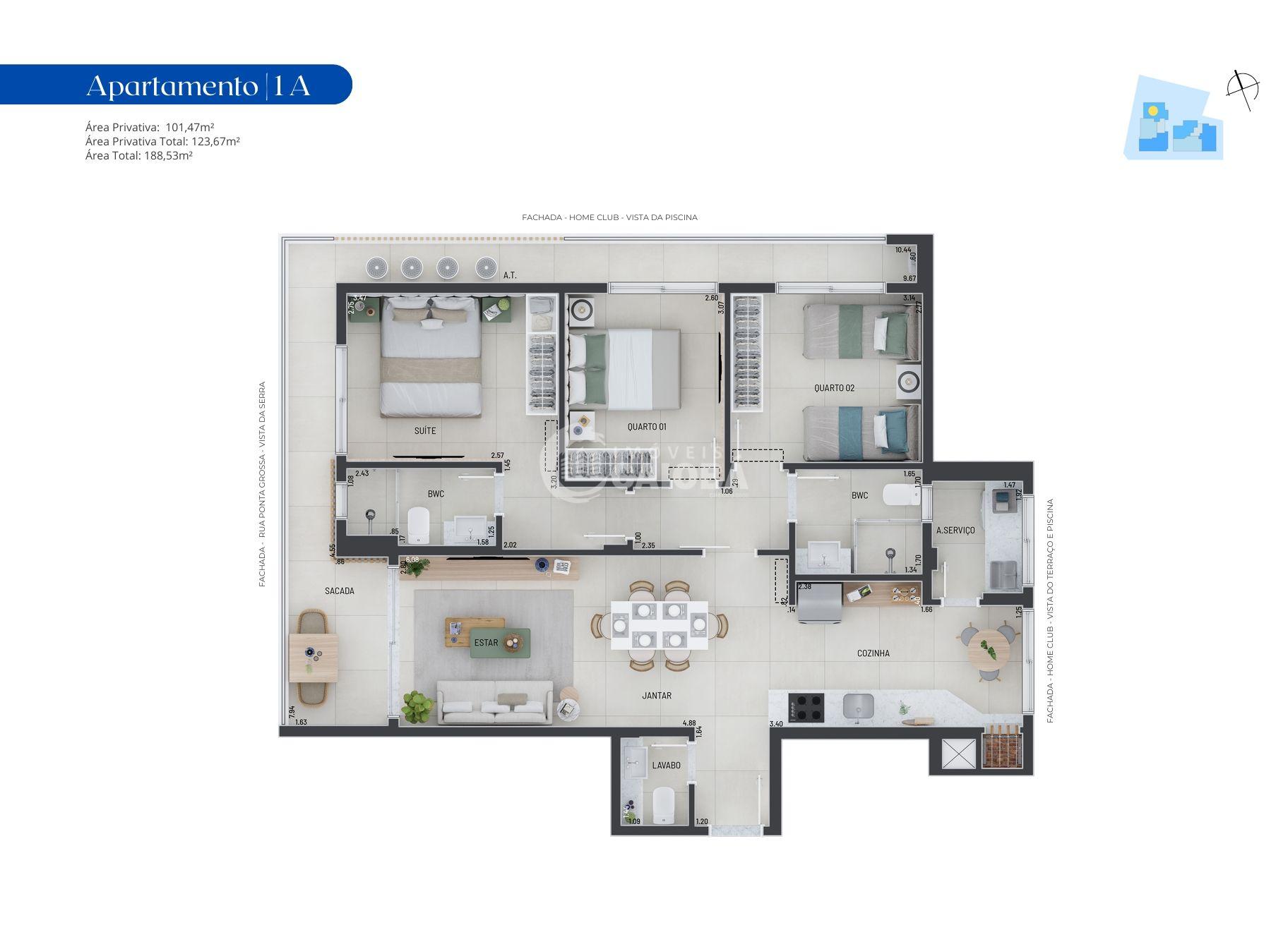 - Apartamentos com 1 suite e 2 Quartos;