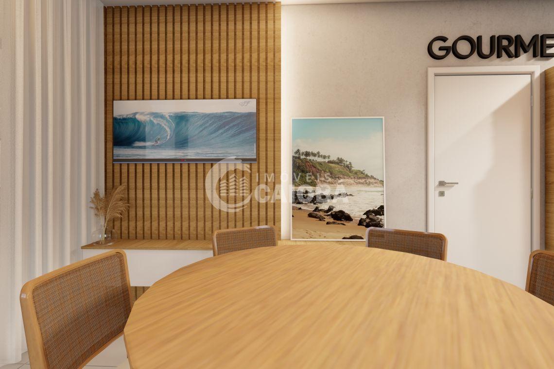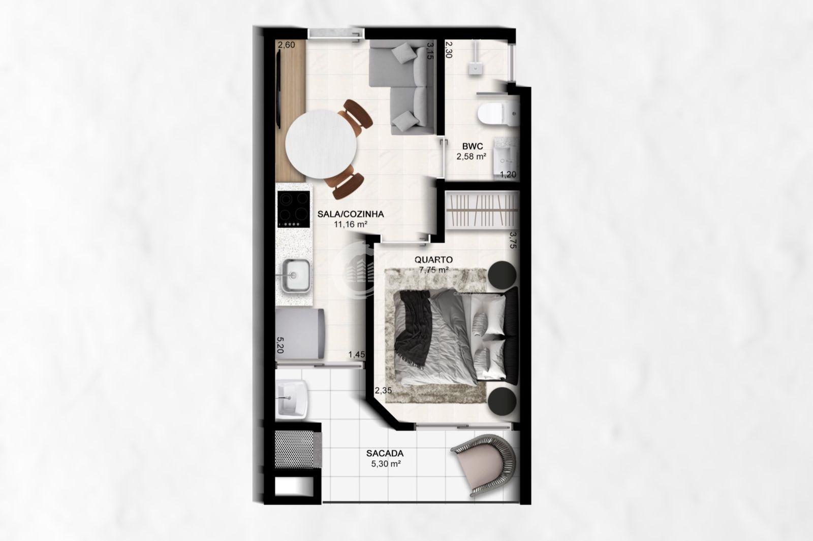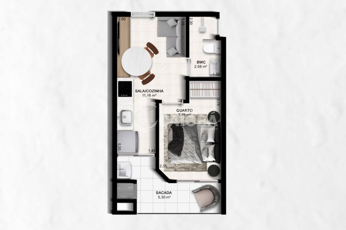 Características do Imóvel com 01 dormitório, banheiro social, sala de estar integrada com a cozinha, área de serviço, sacada com churrasqueira e 01 vaga de garagem.