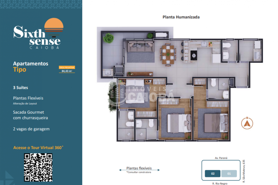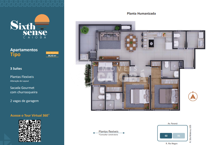Unidade: 301 | Tipo | Dormitórios: 3 suítes | Área Privativa: 84,43 | Área Total: 133,20 | Preço de Lançamento: R$859.000,00 ( Tour Virtual 360º)