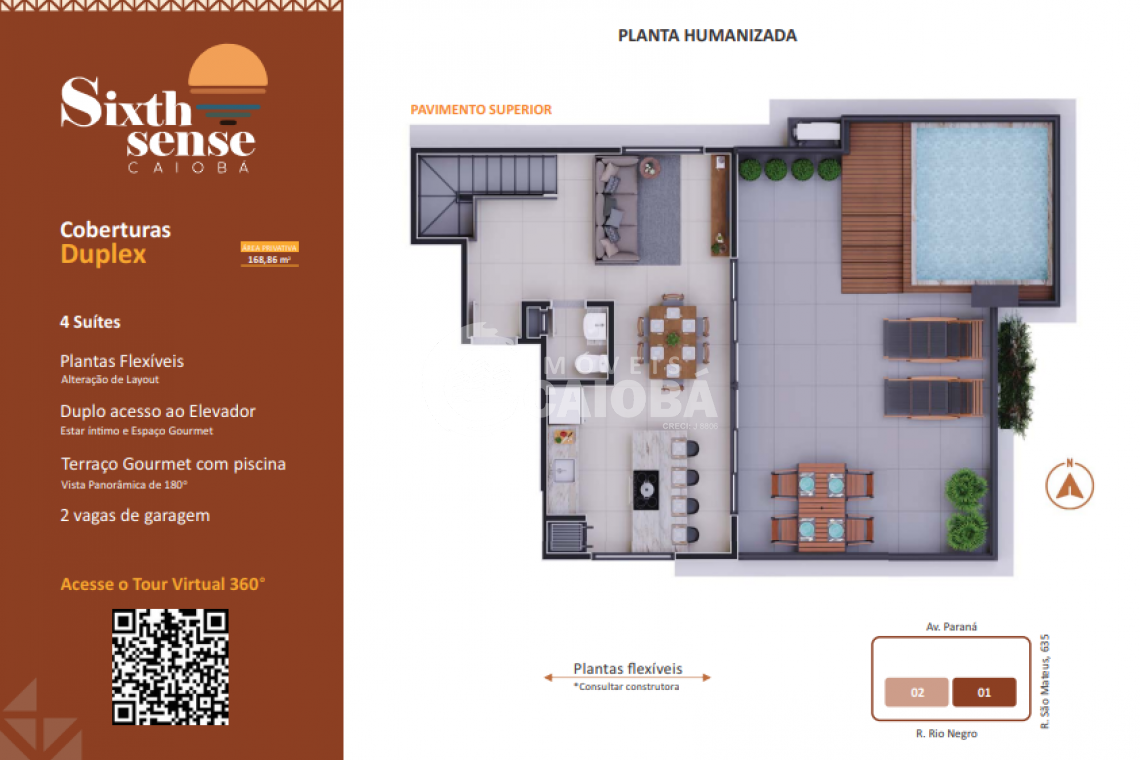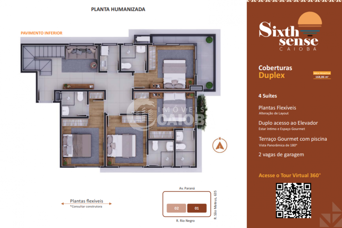 Unidade: 602 | Duplex | Dormitórios: 4 suítes | Área Privativa: 168,86 | Área Total: 219,41 | Preço de Lançamento: R$1.899.000,00 ( Tour Virtual 360º)