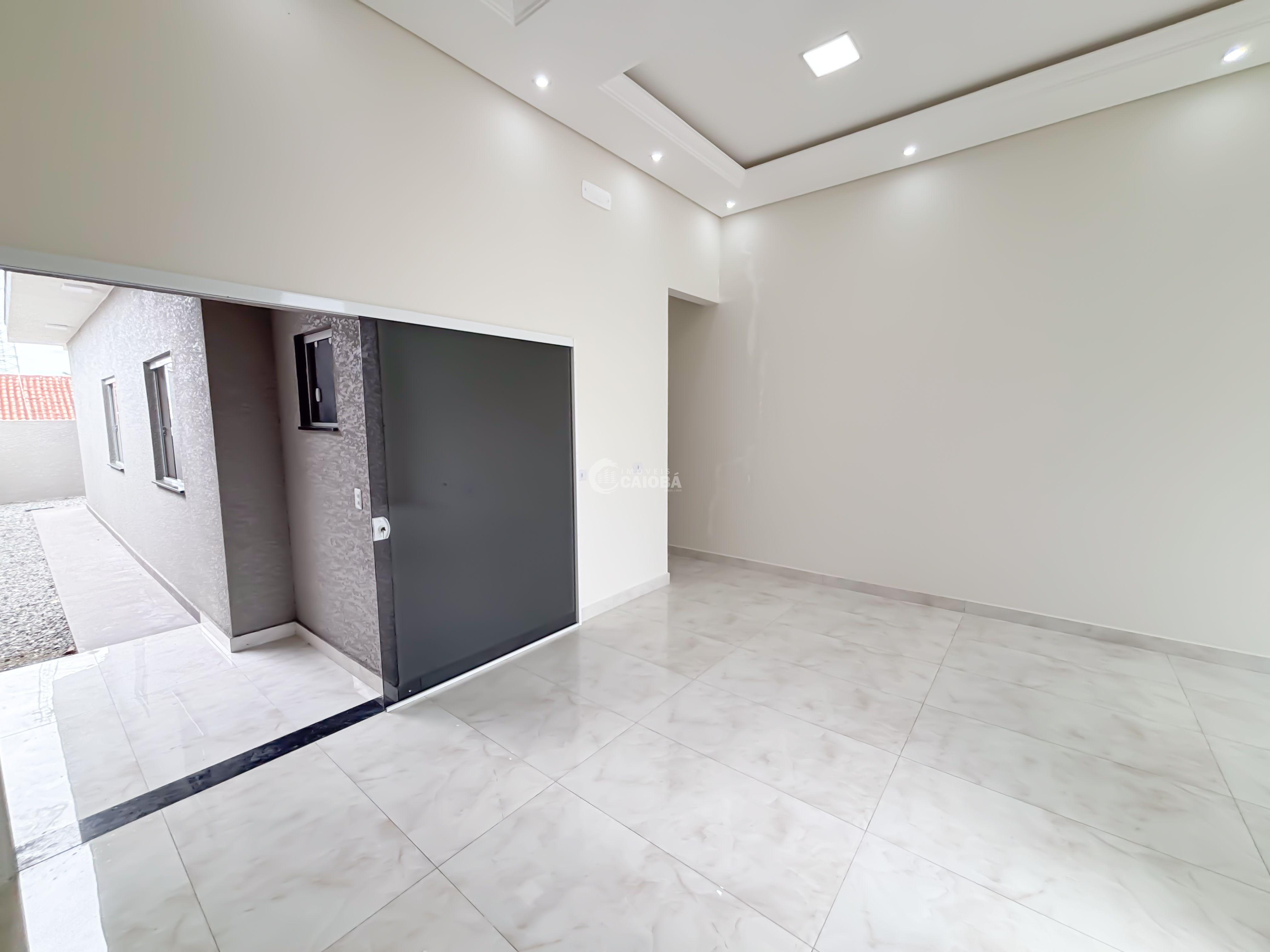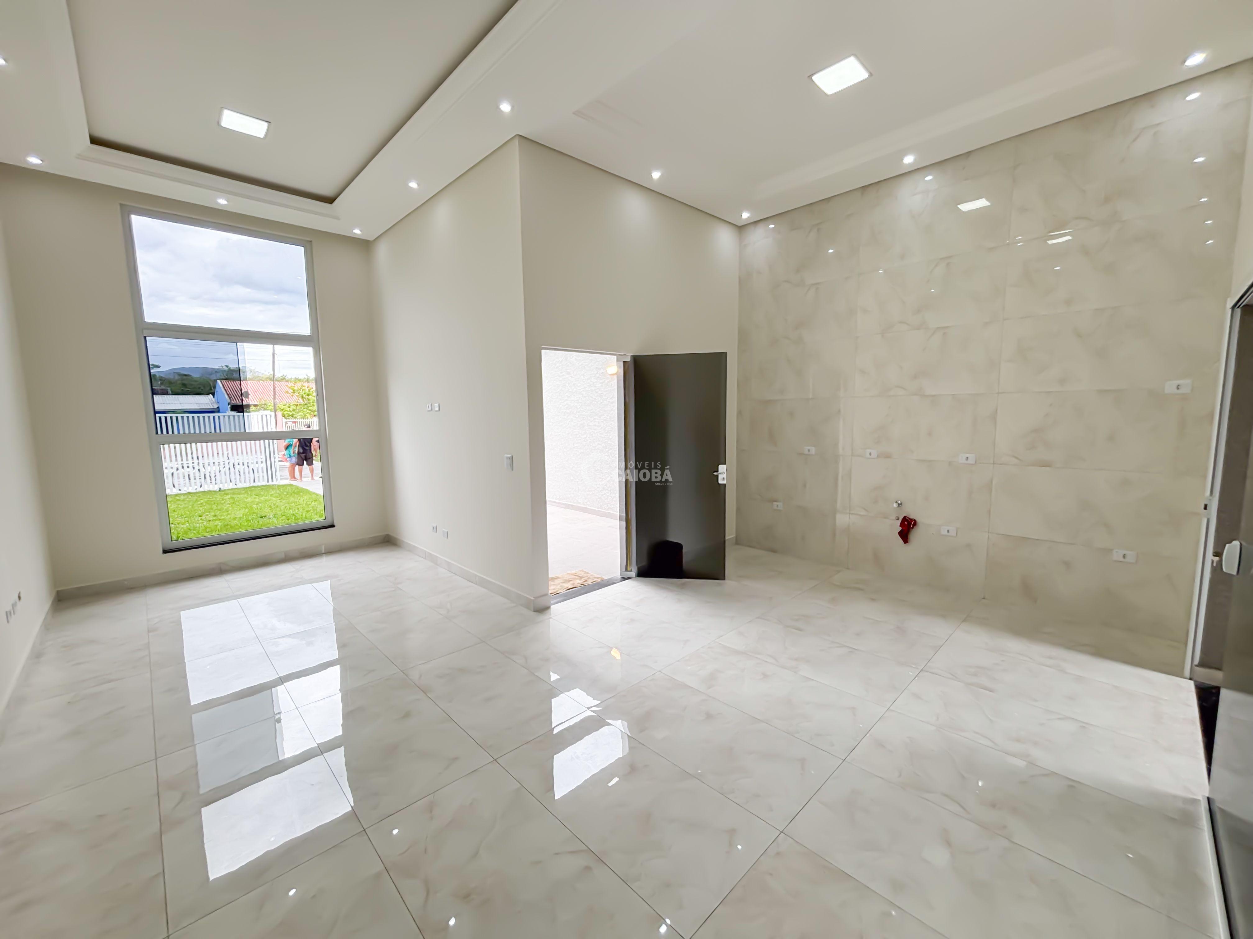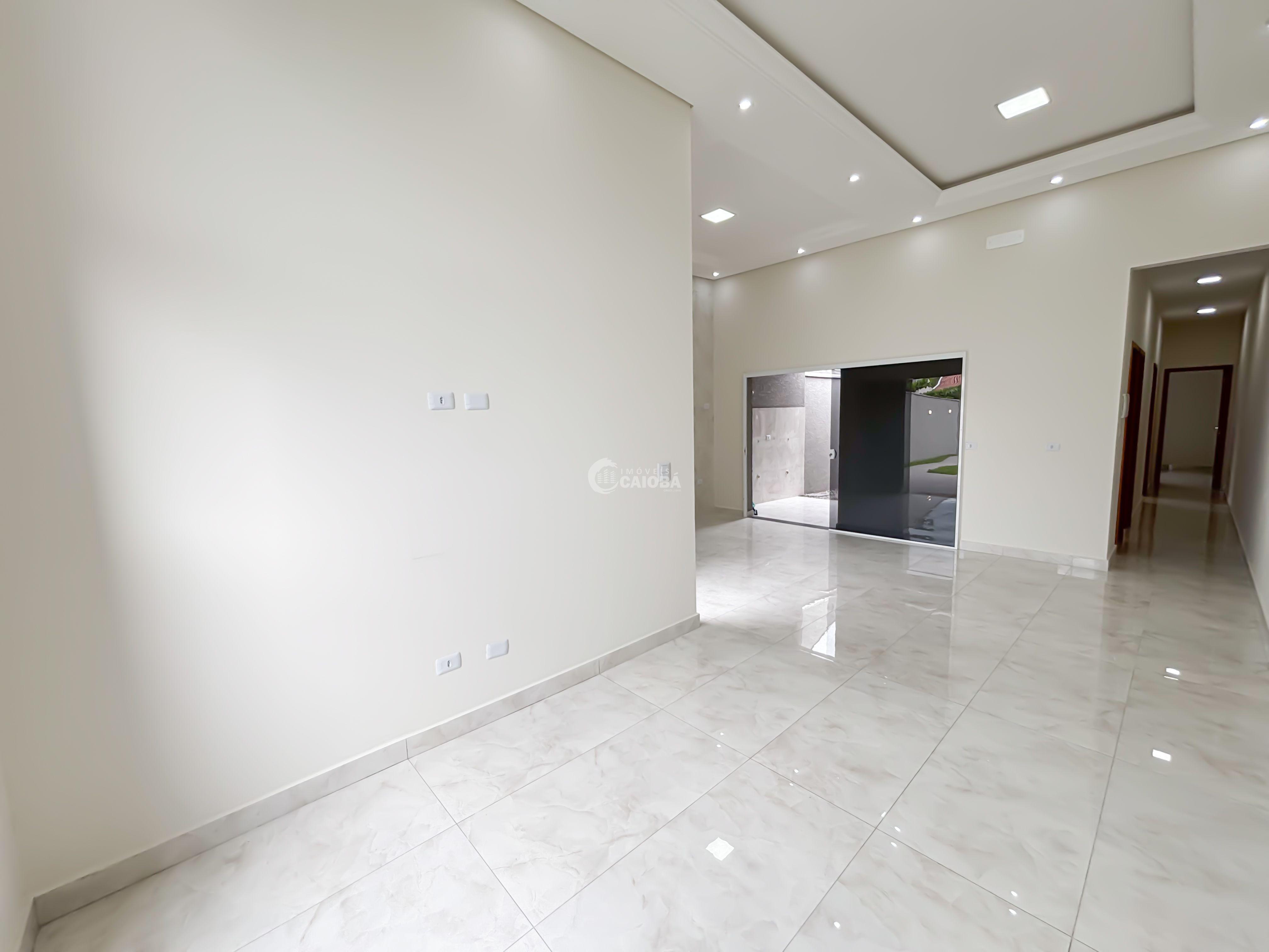 Casa nova a poucos metros da praia com arquitetura moderna e funcional, com pé direito alto com rebaixamento em gesso e iluminação embutida.