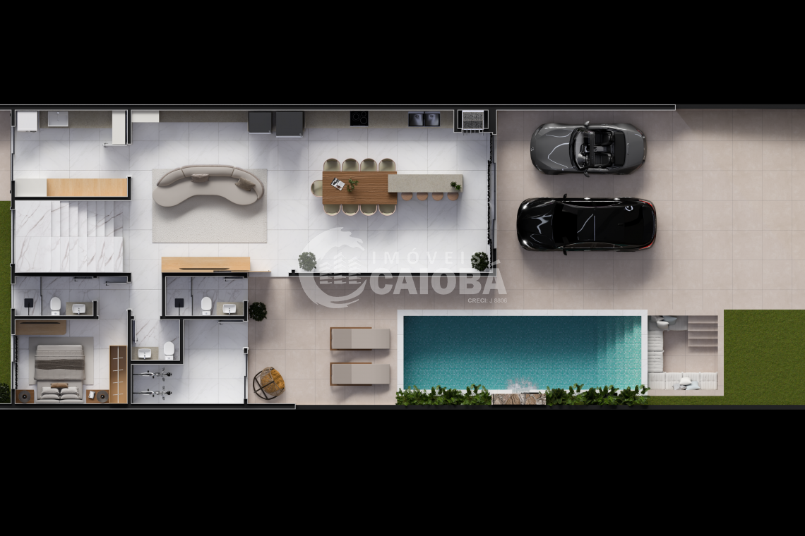 - Sala de estar, janta e cozinha em conceito aberto;